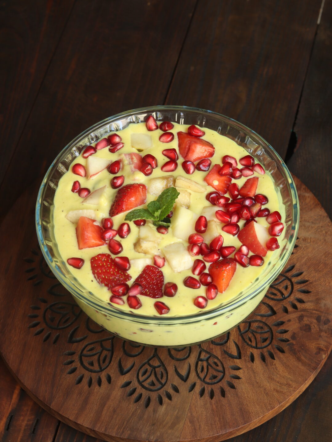 | 5. | Pour the chilled custard over the fruits. |